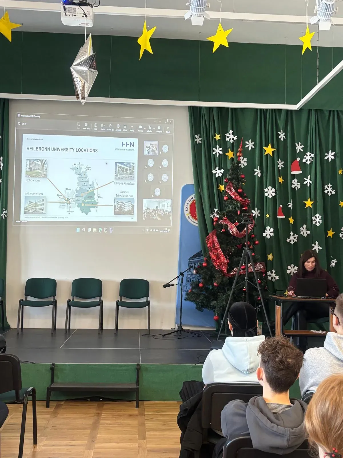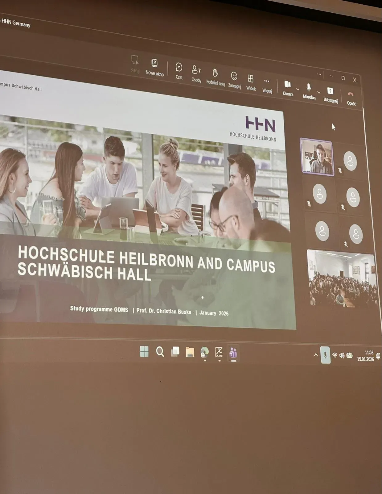 W ramach Tygodnia Odpowiedzialności, realizowanego w naszej szkole, w dniu 19 stycznia 2026r. uczniowie oraz nauczyciele uczestniczyli w międzynarodowym spotkaniu online z prof. Christianem Buske z Hochschule Heilbronn – Campus Schwäbisch Hall (Niemcy). Wydarzenie wpisało się również w działania prowadzone w ramach projektu Erasmus+, którego celem jest poszerzanie kompetencji językowych, kulturowych oraz edukacyjnych uczniów.