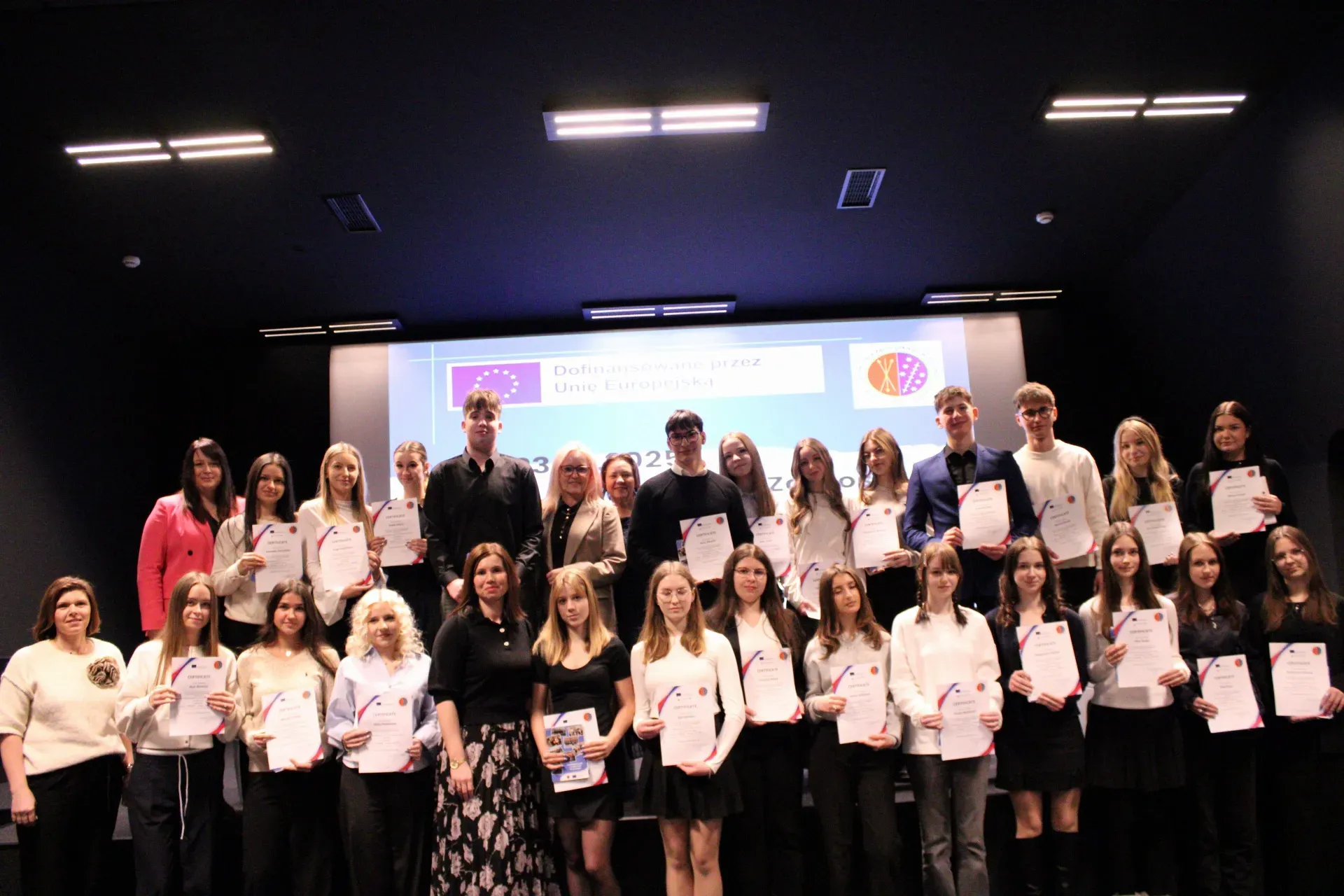 Po zakończeniu debaty odbyło się uroczyste wręczenie certyfikatów uczestnikom projektu Erasmus+, podkreślające ich aktywny udział oraz zaangażowanie w realizację działań projektowych.
